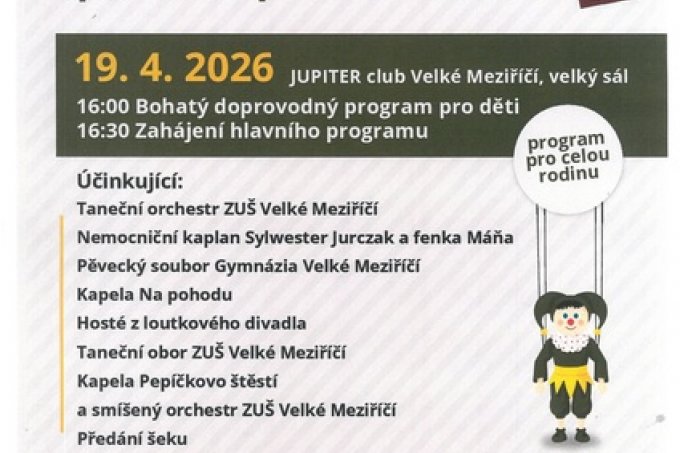 Neděle 19. 4. 2026 * 16 hodin * velký sál Jupiter clubu. Účinkující: Taneční orchestr ZUŠ Velké Meziříčí, Nemocniční kaplan Sylwester Jurczak a fenka Máňa,…
