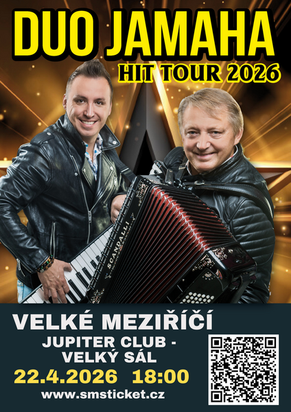 Středa 22. 4. 2026 * velký sál JC * 18 hodin. Předprodej vstupenek na: https://www.smsticket.cz/nakup/krok-1-mistenky/61217-koncert-duo-jamaha-hit-tour-2026-velke-mezirici-jupiter-klub-velke-mezirici zahájen.