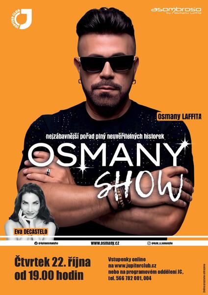 Čtvrtek 22. 10. 2026 * 19 hodin * velký sál JC. Osmany Lafita, Eva Decastelo, nejzábavnější pořad plný neuvěřitelných historek. Prodej vstupenek zahájen na https://www.jupiterclub.cz/udalosti/divadlo/171868-osmany-show