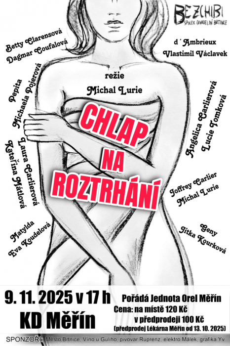 Jednota Orel Měřín pořádá divadelní představení Chlap na roztrhání. Předprodej vstupenek od 13.10. v Lékárně v Měříně - 100 Kč. Na místě vstupenka 120 Kč. Hraje divadelní spolek Brtnice - Bezchibi.