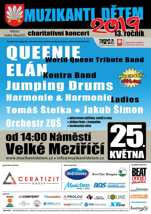 13. ročník charitativního koncertu Muzikanti dětem proběhne 25. 5. 2019 od 14:00 na náměstí ve Velkém Meziříčí.