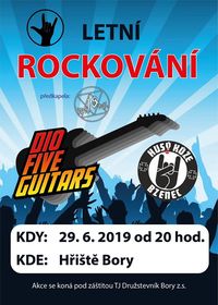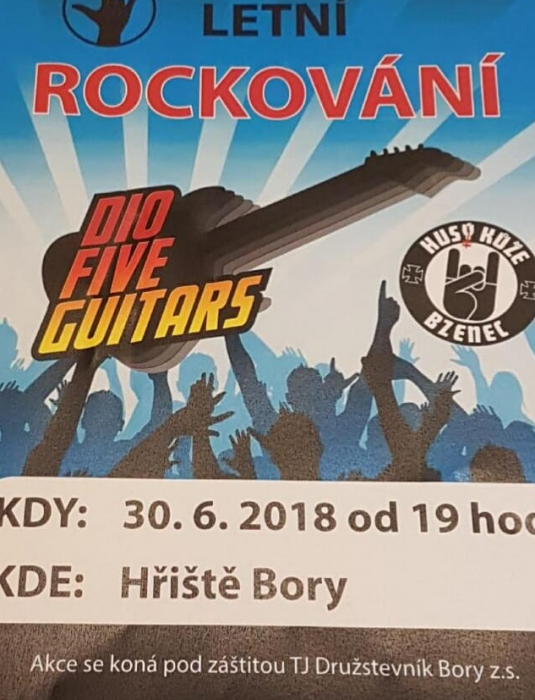 Můžete se těšit na skupinu Dio Five Guitars a Husý kůže. Akce se koná u fotbalového hřiště. Těší se na vás TJ Družstevník Bory.