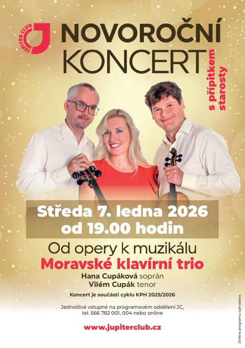 Zveme vás na každoroční Novoroční koncert s přípitkem. Renomované Moravské klavírní trio s vyhlášenými pěveckými hosty představí tradiční svátečně laděný program zaměřený na slavné árie a dueta z oper a operet světového repertoáru.