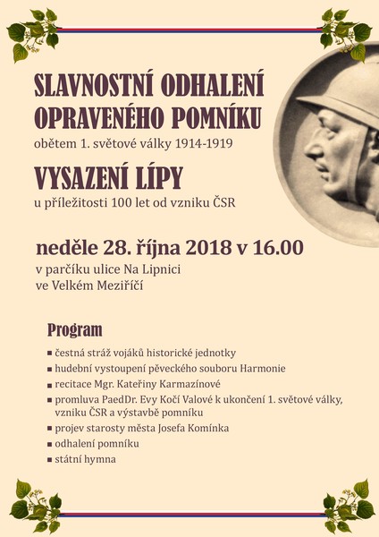 - promluva PaedDr. Evy Kočí Valové k ukončení 1. světové války, vzniku ČSR a výstavbě pomníku