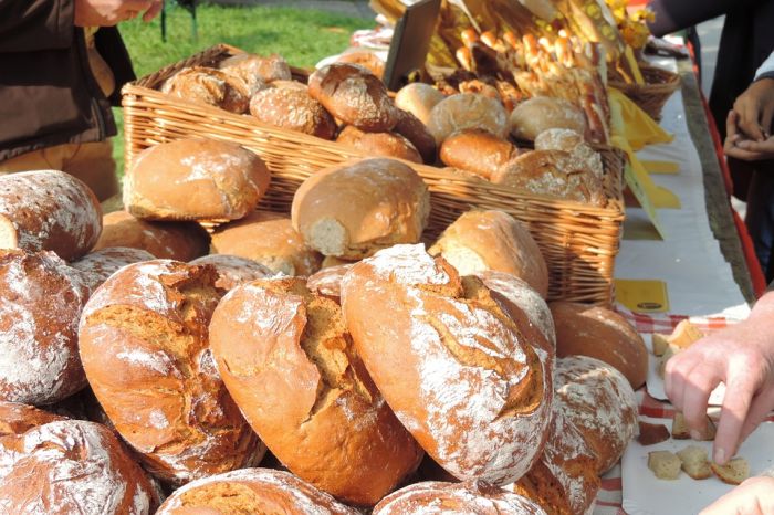 Sortiment řemeslných výrobků, ovoce a zeleniny, květin, občerstvení a cukrovinek.