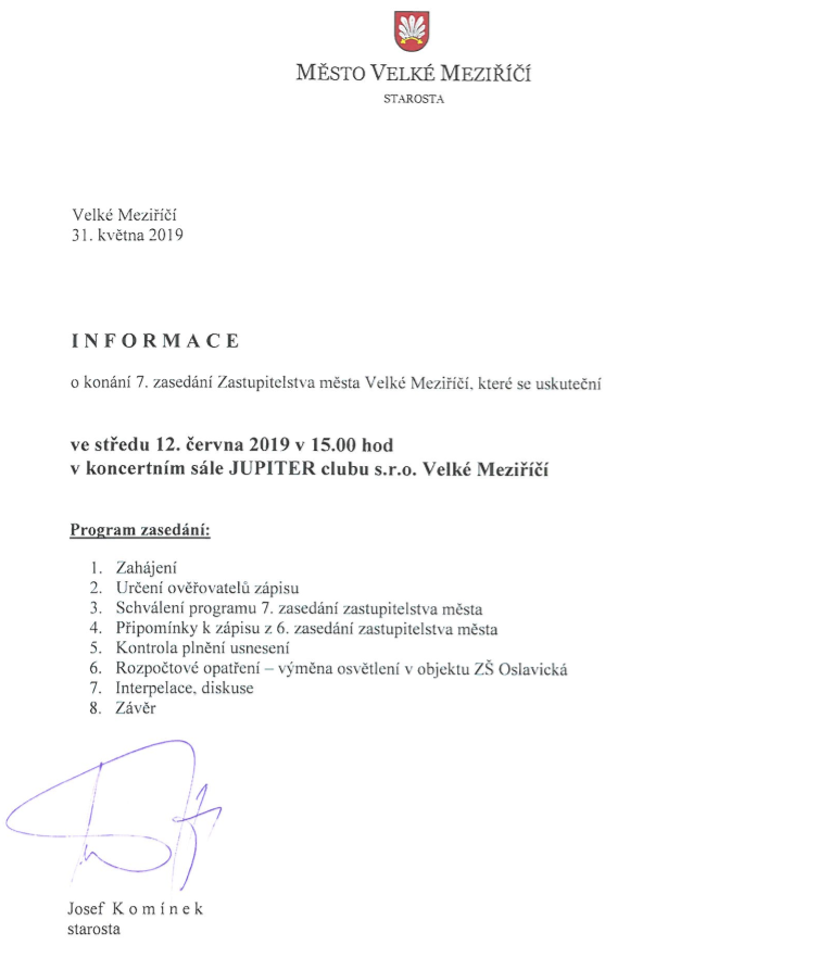 Pozvánka na 7. zasedání Zastupitelstva města Velké Meziříčí, které se uskuteční 12. 6. 2019 od 15 hodin.
