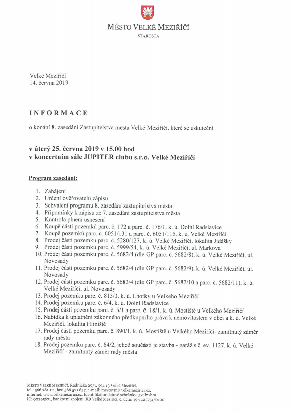 Zastupitelstvo města proběhne 25. 6. 2019 od 15 hodin v koncertním sále Jupiter clubu.