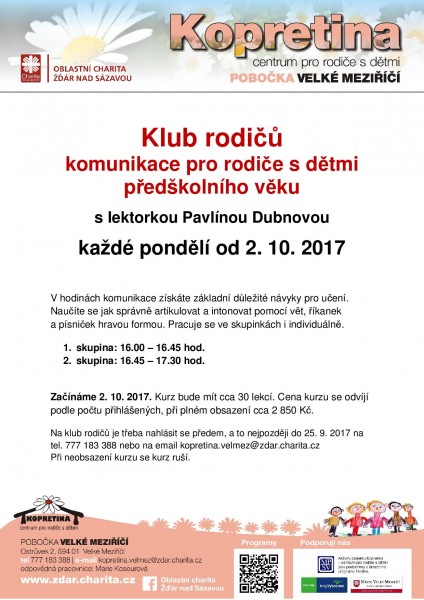 Klub rodičů – komunikace pro rodiče s dětmi předškolního věku s lektorkou Pavlínou Dubnovou, každé pondělí od 2. 10. 2017.