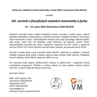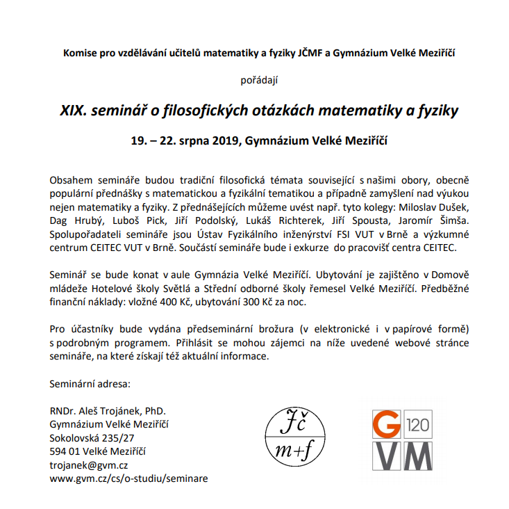 Komise pro vzdělávání učitelů matematiky a fyziky JČMF a Gymnázium Velké Meziříčí pořádají XIX. seminář o filosofických otázkách matematiky a fyziky v termínu19. – 22. srpna 2019.