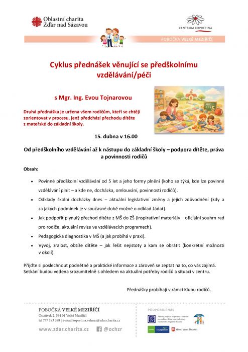 Přednáška s Mgr. Ing. Evou Tojnarovou je určena všem rodičům, kteří se chtějí zorientovat v procesu, jenž předchází přechodu dítěte z mateřské do základní školy.