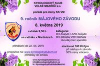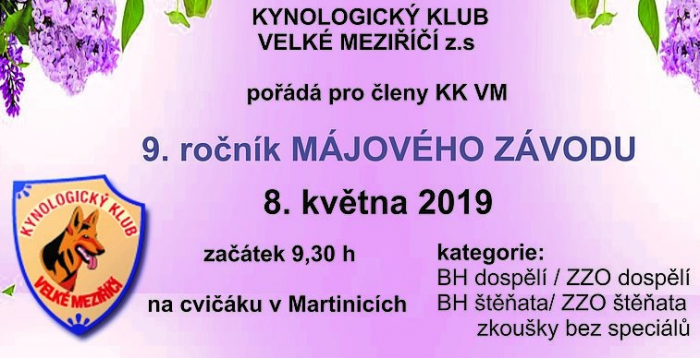 Koná se 8. 5. v Martinicích na cvičáku. Lze se přihlásit do štěňat ( do 12 měsíců psa) nebo do dospělých a to kategorie ZZO nebo BH. Bude se soutěžit dle řádu bez speciálů. U štěňat povolen pamlsek. Cena startovného 100 Kč a po nastoupení závodu vám bude 1/2 ceny vrácena.
