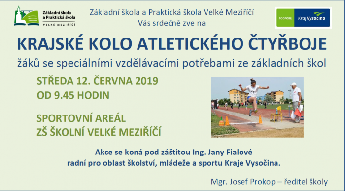 KRAJSKÉ KOLO ATLETICKÉHO ČTYŘBOJE žáků se speciálními vzdělávacími potřebami ze základních škol se koná ve středu 12. ČERVNA 2019 OD 9.45 HODIN ve SPORTOVNÍM AREÁLU ZŠ ŠKOLNÍ VELKÉ MEZIŘÍČÍ.