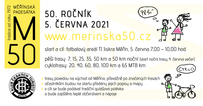 Měřínská padesátka zve na svůj jubilejní 50. ročník. Zvolit si můžete z pěší trasy i cyklotrasy. Start i cíl se nachází v Měříně, na fotbalovém stadionu.