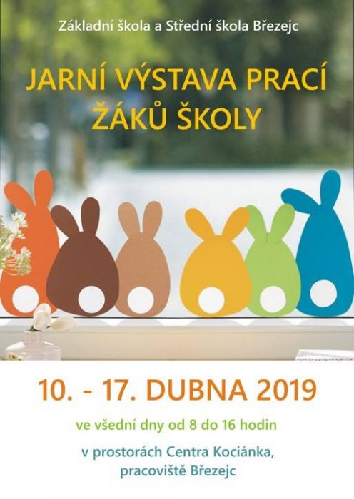 Základní škola a Střední škola Březejc si vás dovoluje pozvat na jarní výstavu prací žáků školy, která proběhne od 12. do 17. dubna 2019 (ve všední dny od 8 do 16 hodin) v prostorách Centra Kociánka, pracoviště Březejc.