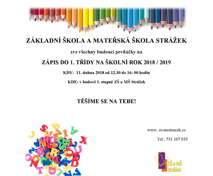 Základní škola a Mateřská škola Strážek zve budoucí prvňáčky na zápis do 1. třídy na školní rok 2018/19.