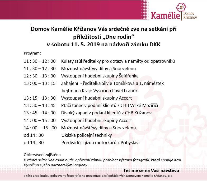Domov Kamélie Křižanov Vás srdečně zve na setkání při příležitosti "Dne rodin" v sobotu 11. 5. 2019 na nádvoří zámku DDK.