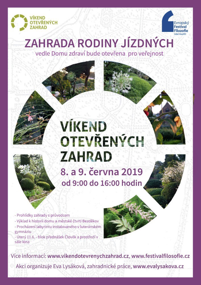 Návštěvníky provede autorka a realizátorka rekonstrukce zelených částí zahrady Eva Lysáková a její tým. Ѻ HISTORIE MÍSTA: Nemovitost se nachází v místech, které je součástí městské zástavby od poloviny 16. století. Historii domu a vývoj předměstí Bezděkov představí velkomeziříčský historik Mgr. Martin Štindl, Ph.D. Ѻ LABYRINT JAKO CESTA – možnost procházení instalovaného labyrintu: sobota a neděle od 10 do 14 hodin přítomnost autorky u labyrintu. Labyrint není bludiště, je to prastarý nástroj k meditaci v chůzi. Důležité zde není hledání cesty, ale sám proces cesty, která je daná, rozhodně však ne přímá – obrat a změna je její nabídka. Program je vhodný pro dospělé i děti a představí jej Asol Daniela (https://labyrinty.webnode.cz/), tvůrkyně kamenného řečiště v prezentované zahradě. Místo konání bude upřesněno. Ѻ SUCHO, KŮROVEC A MY: úterý 11. 6. od 17 hodin – odborná přednáška, prezentovaná v rámci Filozofického festivalu v bloku Životní prostředí. Přednáší Mgr. Filip Lysák, odborník na revitalizaci krajiny, spolu s dalšími odborníky na ochranu přírody v ČR. Místo konání: Jupiter Club - kino, Náměstí 17. Ѻ PRODEJ PŘEBYTKŮ: Za příznivé ceny nabídneme přebytky z této zahrady: orlíček, rudbeckie, kontryhel, plicník a další rostliny.