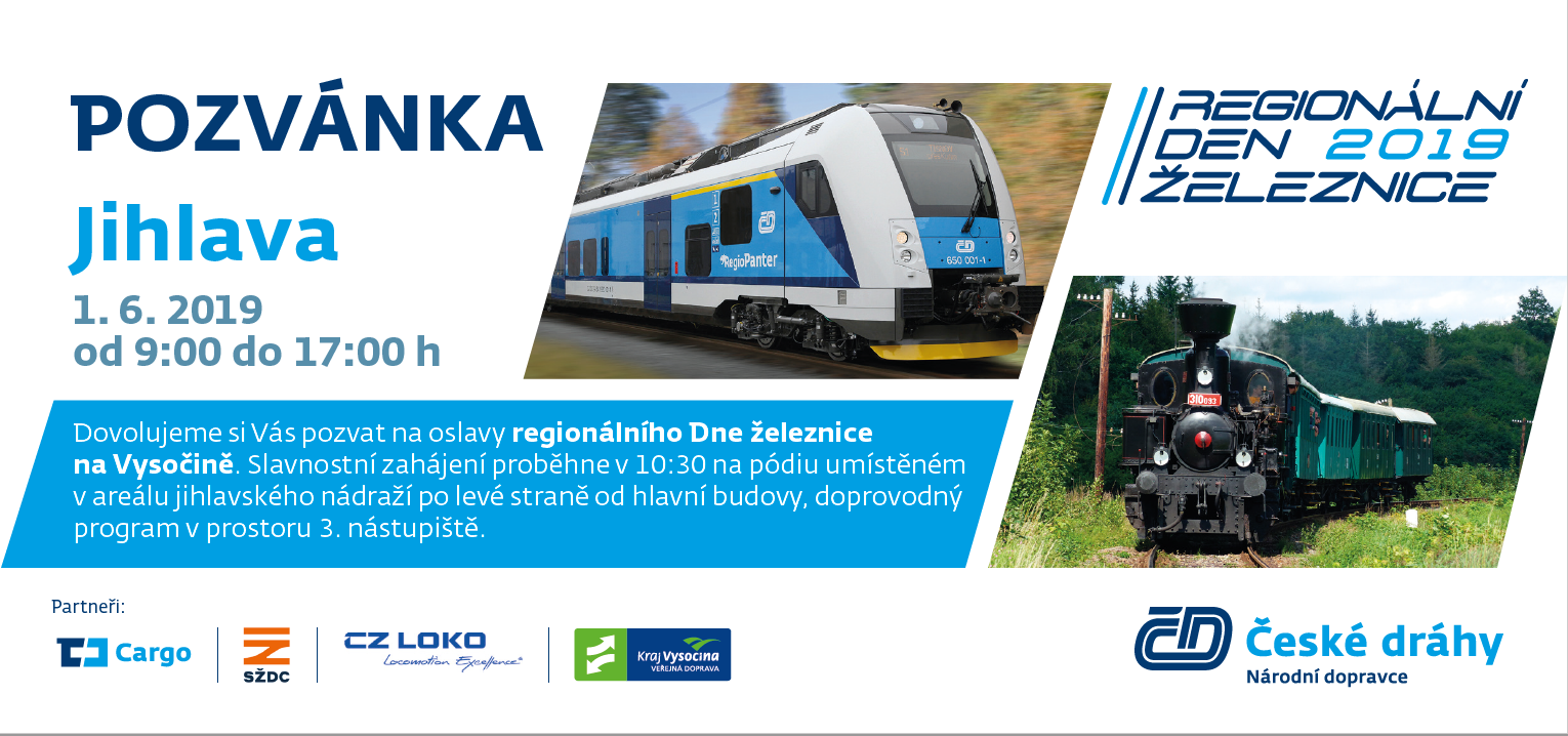 První červnový den se tu koná Regionální den železnice s jízdami zvláštních vlaků, výstavou vozidel a pestrým doprovodným programem.Slavnostní zahájení proběhne v 10:30 na pódiu umístěném v areálu jihlavského nádraží po levé straně od hlavní budovy, doprovodný program v prostoru 3. nástupiště.