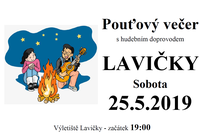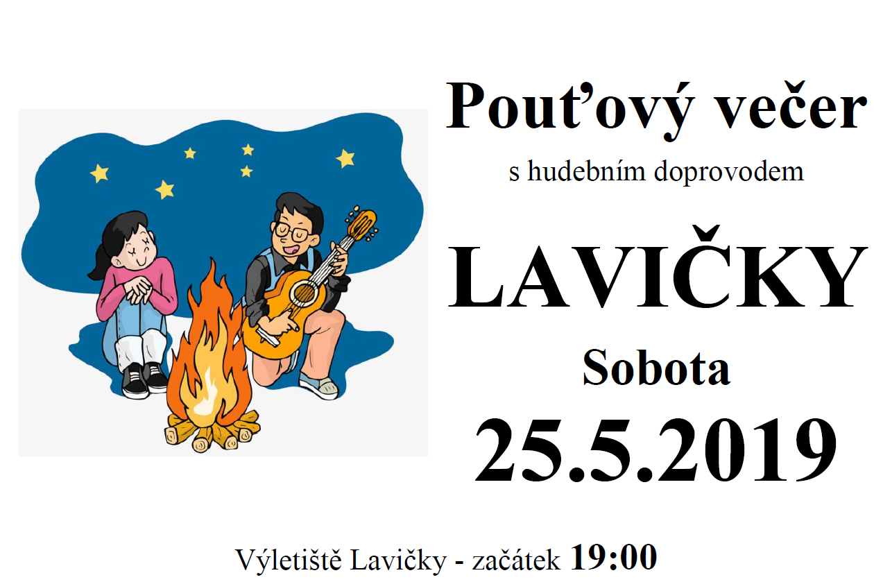 Začínáme v sobotu 25. 5. 2019 od 19 hodin na místním výletišti v Lavičkách. Přijďte si zazpívat a poveselit se, budeme se na Vás těšit.
