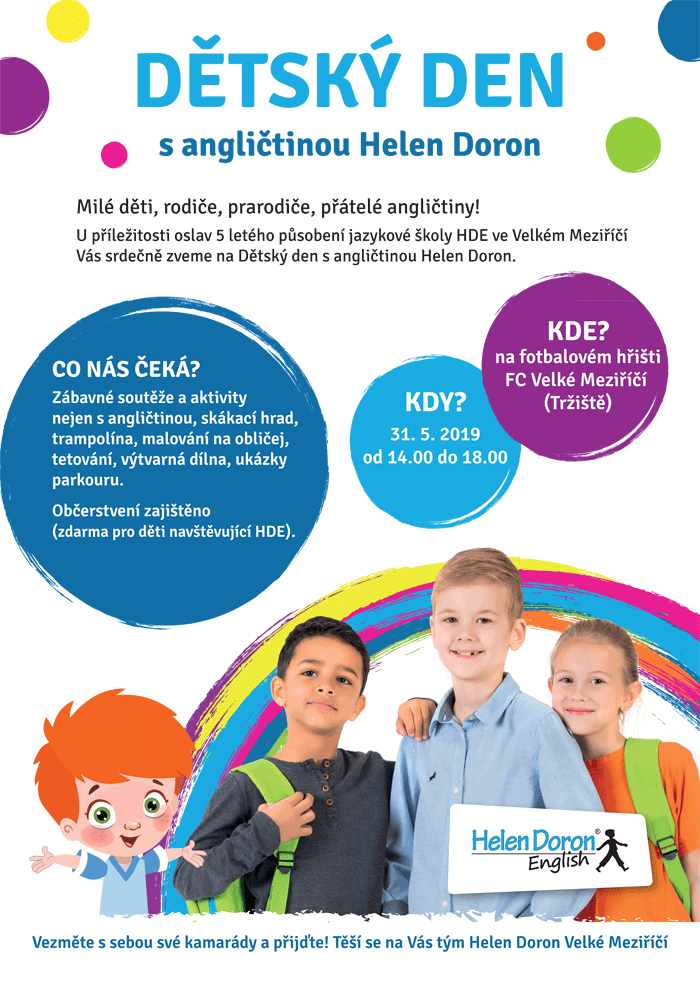 Milé děti, rodiče, prarodiče, přátelé angličtiny!U příležitosti oslav 5 letého působení jazykové školy HDE ve Velkém Meziříčí Vás srdečně zveme na Dětský den s angličtinou Helen Doron.