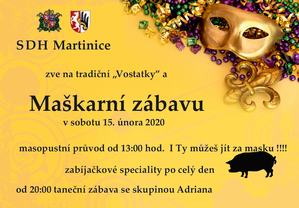 Sbor dobrovolných hasičů Martinice vás zve na tradiční Vostatky a následnou zábavu se skupinou Adriana. Zabijačkové speciality se budou podávat po celý den.