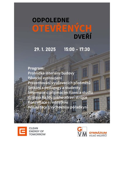 Odpoledne otevřených dveří pro zájemce o studium, rodiče, absolventy i širokou veřejnost pořádá velkomeziříčské gymnázium ve středu 29. ledna od 15:00 do 17:30.