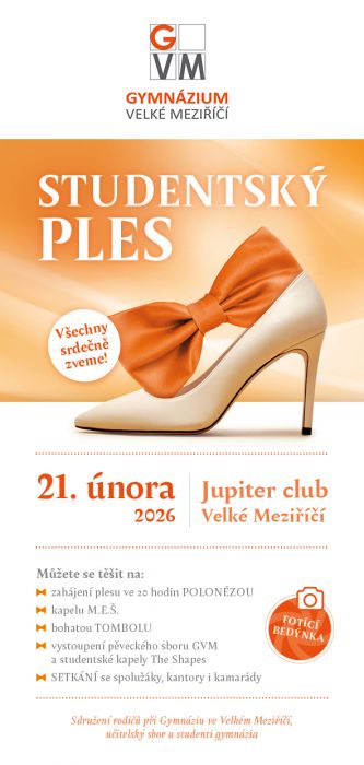 Sdružení rodičů při Gymnáziu ve Velkém Meziříčí, učitelský sbor a studenti gymnázia zvou všechny na Studentský ples. K poslechu a tanci vystoupí kapela M.E.Š., pěvecký sbor GVM a studenské kapely The Shapes.